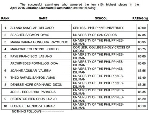 April 2015 Librarian Board Exam Topnotchers (Top 10 Passers)