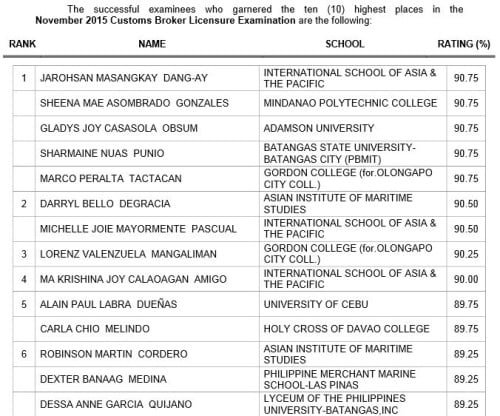 November 2015 Customs Brokers Board Exam Topnotchers (Top 10 Passers)