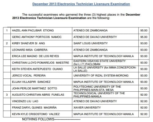 Electronics Technician (ECT) Topnotchers December 2013 Results