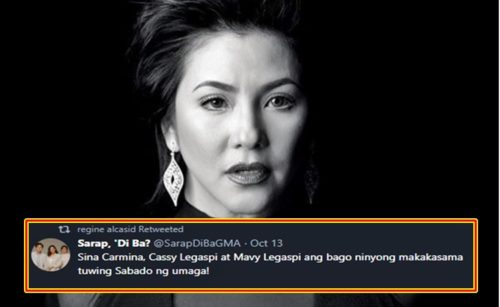 Former GMA show of Regine Velasquez got higher ratings without her Sarap Diva, the show of Regine Velasquez in GMA before she transferred to ABS-CBN, reportedly got higher rating without her. The said cooking show is now called Sarap, Di Ba? and it features Carmina Villarroel with her twins Mavy and Cassy Legaspi. Regine’s cooking … Read more